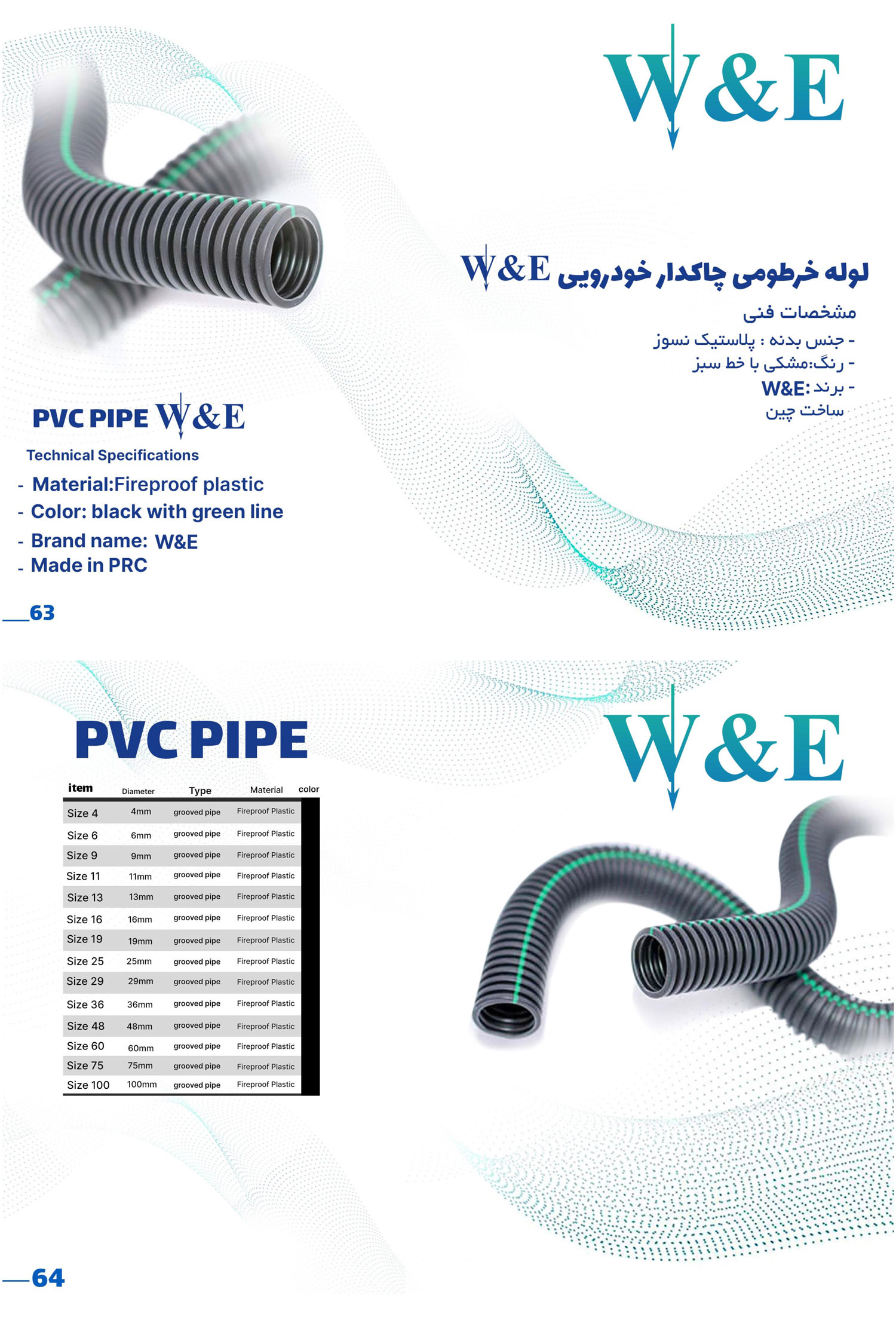 لوله خرطومی چاکدار خودرویی W&E یکی از محصولات با کیفیت موجود در بازار است که از جنس پلاستیک ساخته شده است و در ابعاد 4، 6، 9، 11، 13، 16، 19، 25 و 29 عرضه می شود که هر سایز لوله خرطومی چاکدار برای جایگیری تعداد مشخصی سیم وکابل مناسب می باشد و باید بر اساس کاربرد سایز مناسب انتخاب شود.