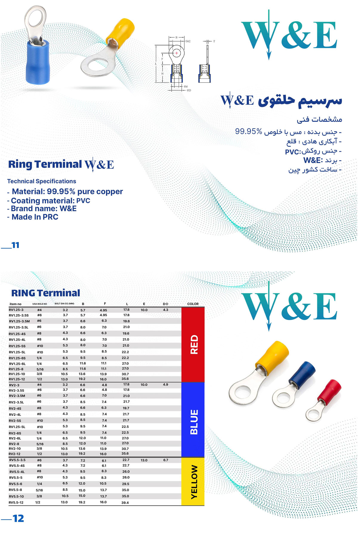 سرسیم مدل RV5.5-5 از برند W&E از نوع حلقوی روکشدار با حداکثر سایز سیم ورودی 6 میلیمتر مربع و قطر حلقه 5 میلیمتر می باشد. سرسیم های گرد یا حلقوی برند W&E از جنس مس خلوص 99% ساخته شده اند و جنس بدنه آن ها PVC می باشد که اتصالی محکم، ایمن و قابل اطمینان را فراهم می آورند.