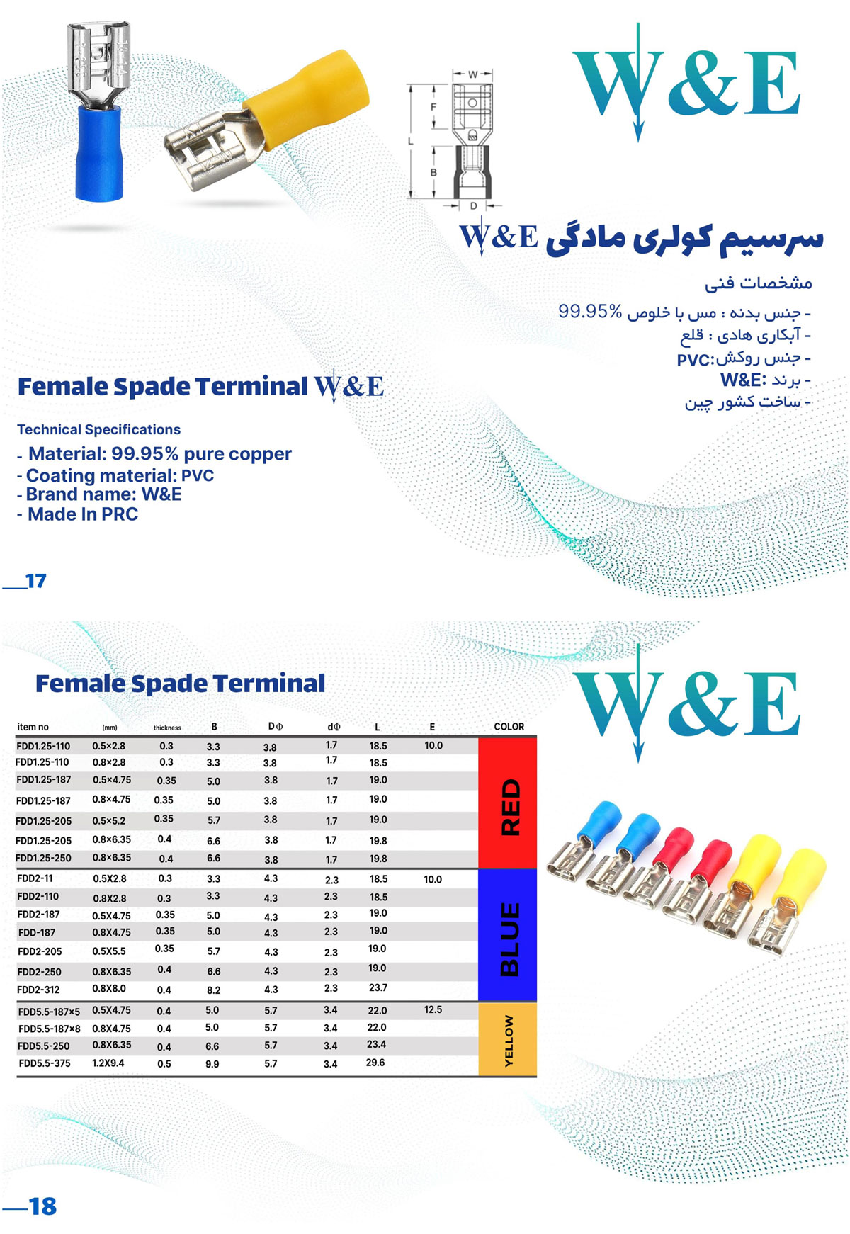 سرسیم فیشی مادگی تمام‌ روکش 1.25 برند W&E گزینه‌ای ایده‌آل برای اتصال سیم‌های نازک با سطح مقطع حداکثر 1.5 میلی‌متر مربع است. این سرسیم با روکش کامل PVC، ایمنی اتصال را افزایش داده و از تماس ناخواسته با هادی جلوگیری می‌کند. طراحی دقیق سوکت و اتصال محکم، آن را برای استفاده در تابلوهای برق، تجهیزات کنترلی سبک و سیم‌کشی‌های ظریف بسیار مناسب کرده است.